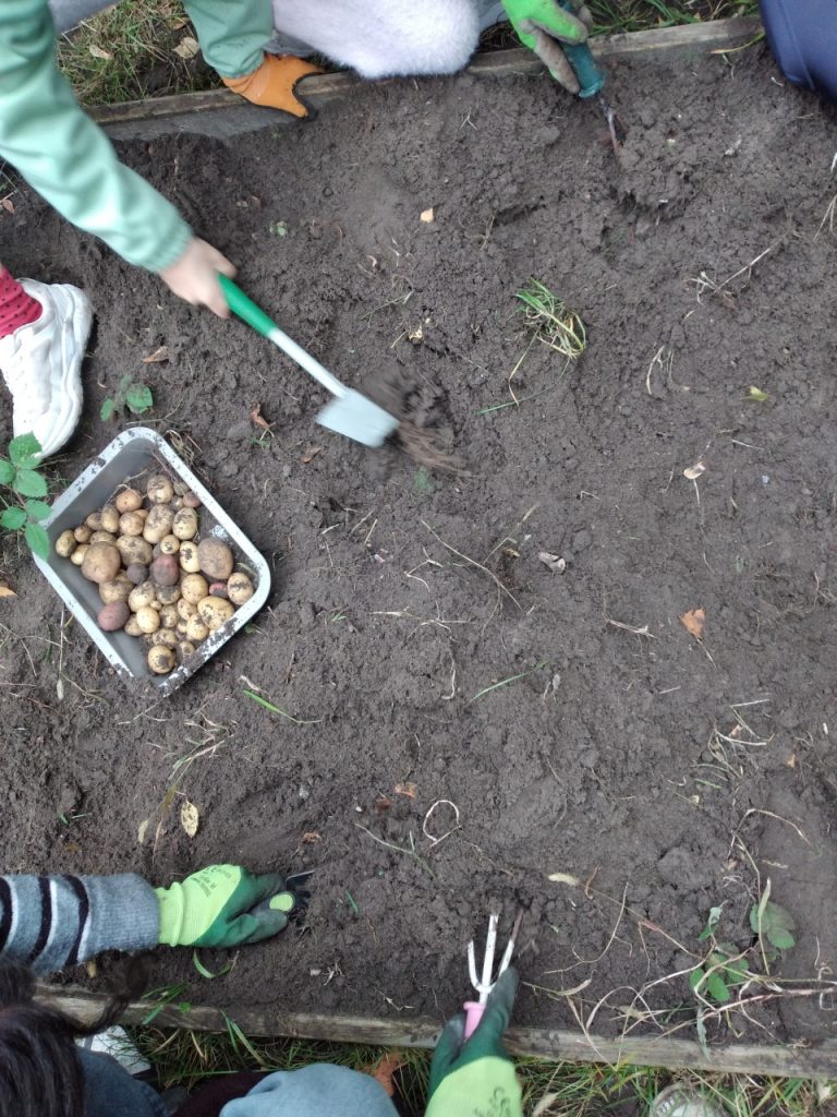 Jubelrufe schallen durch den Schulgarten. „Ich habe eine!“ „Ich auch!“ Die Schatzsuche des Gärtners hat begonnen – Kartoffeln ausbuddeln! Mit Eifer und Freude sind die Schüler der 6c dabei die Kartoffeln aus der Erde zu holen. Im Mai hatten wir die Mutterkartoffeln in die Erde gebracht, nun können wir ernten. Auch die Kürbisse und der Salat werden geerntet. Die Kinder verteilen die Ernte untereinander auf. Die Tomaten sind in diesem Jahr sehr klein, da in diesem Sommer nur wenig gegossen wurde. Die Kletterbohnen werden gepflückt und Pflanzenreste auf den Kompost gebracht. Nun sind die Gemüsebeete leer. Nur die rote Beete lassen wir noch etwas wachsen. Sie hat noch Zeit, da wir sie erst im September gesät haben. Im Dezember ist es dann so weit, sie zu ernten.