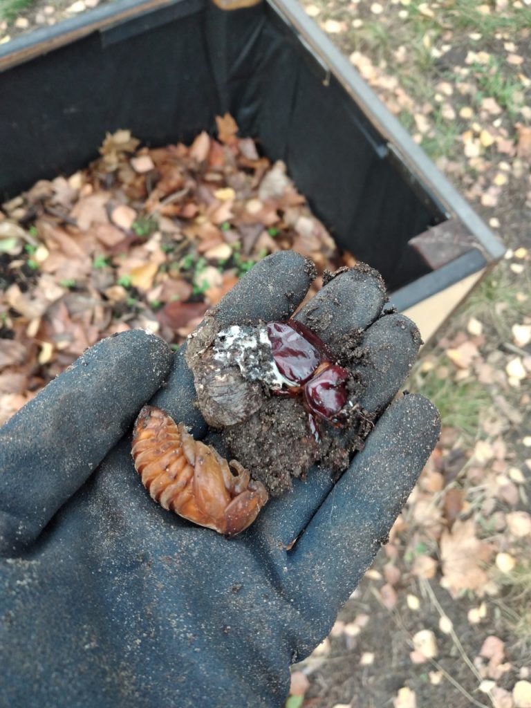 Der Herbst ist die typische Zeit, um den Kompost umzusetzen. Zunächst hatten wir etwas Verständnisschwierigkeiten. Es ging nicht darum einen neuen Standort für den Komposthaufen zu finden! Die im Kompost entstandene Erde soll auf die Beete gebracht werden. Während der Arbeit mit der 5b wird geklärt, wie die neue Erde entstanden ist. Fleißig schippen die Kinder den Inhalt des Komposts auf ein Gitter. Darunter wird die gute Erde in Eimern aufgefangen, um sie auf den Beeten zu verteilen. Das grobe Material, das noch nicht zu Erde geworden ist, landet erneut auf dem Komposthaufen. Viele schaffende Hände lassen schnell Ergebnisse sehen. Zwischendurch finden wir immer wieder Käferlarven im Komposthaufen. Vorsichtig werden die lichtscheuen Tiere umgesetzt. Zufällig finden wir einen toten Nashornkäfer neben einer Käferlarve. Das könnten Mutter und Kind sein. Schnell wird allen klar, hier muss viel Futter für Käferlarven sein, wenn so viele Käfer hier ihre Eier abgelegt haben.