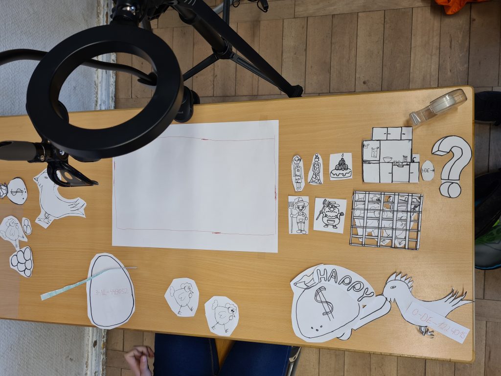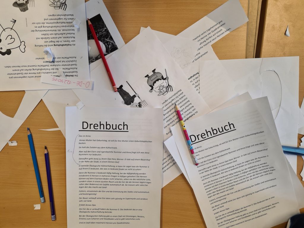 Im GeWi-Unterricht machte sich eine 5. Klasse unserer Schule im Rahmen der Einheit „Ernährung – wie werden Menschen satt?“ daran, Erklärvideos (auch „Explainitys“ genannt) zum Thema „Hühnerhaltung“ anzufertigen. Die Schülerinnen und Schüler stellten sich im Unterricht die große Frage, woher unsere Eier eigentlich kommen und wie sich die Haltung der Hühner gestaltet. Um dieser Frage auf den Grund zu gehen, recherchierten die Kinder die benötigten Informationen im Internet und machten sich in Kleingruppen Gedanken, wie sie ihr neu erworbenes Wissen am besten in ein kurzes Video verpacken können, so dass die Zuschauer dabei möglichst viel lernen und dabei auch noch gut unterhalten werden. Nach einer ersten Ideensammlung und wilden Diskussionen machten sich die Kleingruppen daran, ein eigenes Drehbuch für ihr Erklärvideo zu erstellen. Die benötigten Bilder und Textbausteine fertigten die Kinder selbst an. Als schließlich die nötige Requisite fertiggestellt war, ging es ans Drehen der Videos. Vor dem finalen Take gab es natürlich auch die ein oder andere Probeaufnahme. Das Drehen der Videos fand im Klassenzimmer statt. Mit der Kamera wurden die Erklärvideos mit Stativ und entsprechender Beleuchtung abgedreht.